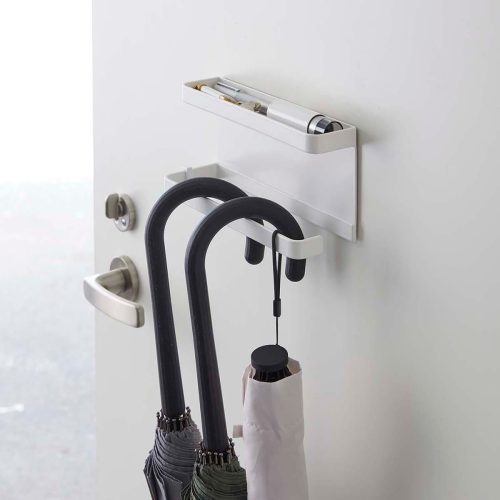玄関扉に直接取り付けられるマグネット式のアンブレラホルダーです。スチール製の扉にマグネットで簡単に設置可能。工具を使わずに取り付けが完了します。長傘や折りたたみ傘をかけて収納できるだけでなく、トレー部分に印鑑・ボールペンなどの小物も置けるのが特徴です。