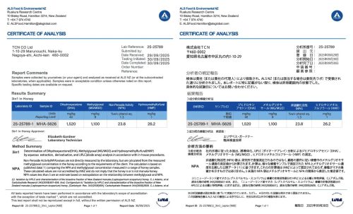 マヌカハニーはコンテナで輸送中に高温状態になると、品質低下が考えられます。国際輸送時温度管理保証は、海上輸送よりもコストのかかる空輸や冷蔵コンテナを使用して輸送したことの証明です。認定書や分析書は本物のマヌカハニーという証し。MGS正式認定書やMGS・MGOの分析書が一緒に届き、品質が確認できます。