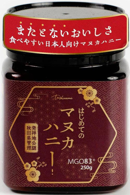 ミツバチの健康を考え、冬を越すタイミングは巣箱の蜜を全て採取せず健康に成長できるように配慮。こうした工夫で、おいしさを追求しています。内容量は250g。MG100+~650+の4つのグレードがあり、好みに合わせておすすめ商品を選べます。