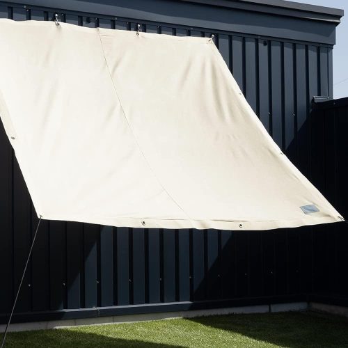サイズは約幅200×300cm。全方位に12個のハトメが付いたタープ式なので、場所に合わせて縦・横どちらでも設置できて便利です。ハトメはアルミ製で、錆びや汚れに強いのがポイント。夏の強い日差し対策に活躍するモデルを探している方におすすめです。