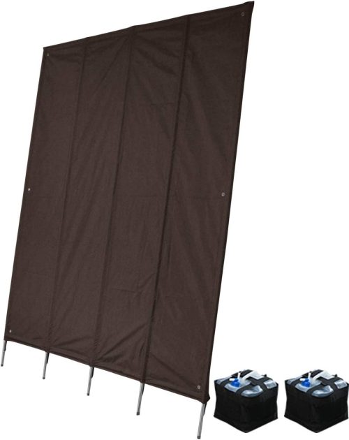 高さを約180~290cmに調節可能なサンシェード。スクリーンサイズは約高さ125×幅195cmで、角度を変えて日差しを遮れます。スクリーンを垂直に下ろすとプライバシーカーテンとしても使用可能です。
