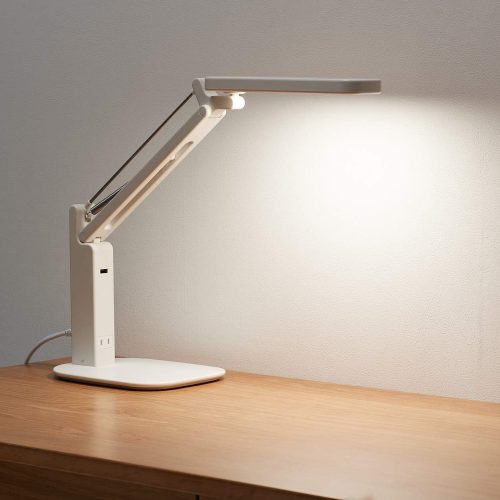 USBポートとコンセントを備えた多機能の製品。スマホなどの充電もでき、デスク周りをすっきりと整理できるのが魅力です。自然光に近い光を実現し、調光は2段階で調整でき使用シーンに応じて明るさを切り替えられます。
