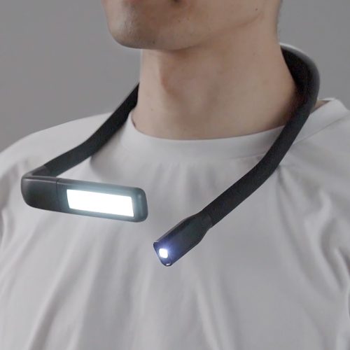 2種類のLEDを搭載した首掛けタイプの読書灯です。面で照らす広範囲LEDは、読書や夜の釣りといった手元を確認したいときにぴったり。270°の角度調節や3段階の色温度調節、無段階の明るさ調節が可能です。