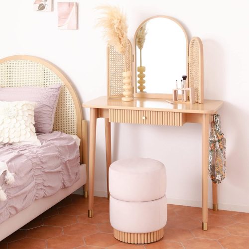 多彩な使い道があるドレッサーチェア。天然木を使用しており、ナチュラルな色合いと繊細な木目が魅力です。スツールとしてはもちろん、ミニサイドテーブルとしても活用できます。