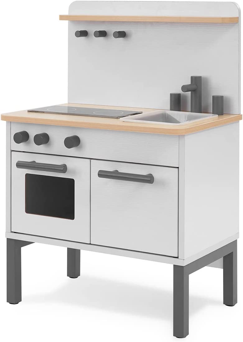 おしゃれな北欧風デザインのおままごとセットです。コンロ・蛇口・収納棚などが付いており、リアルなキッチンのように使えるのが魅力。蛇口やコンロのツマミは動かせるので、より楽しみながらおままごと遊びができます。