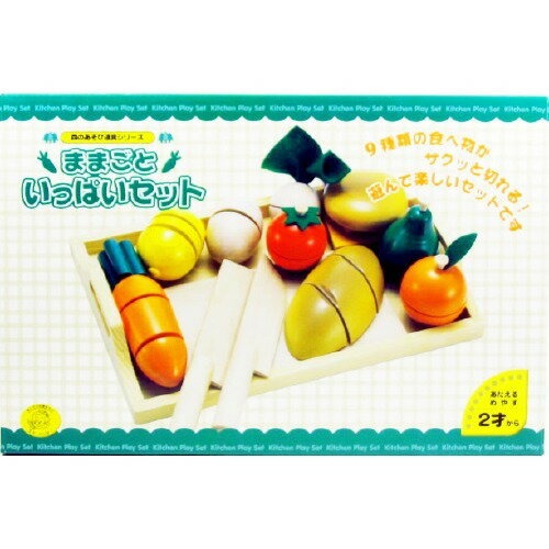 木箱・包丁・パンナイフ・まな板のほか、にんじん・じゃがいも・たまご・パンなどの食材が入ったセット。食材は大きめのサイズで、小さい子供でも切りやすく、誤飲しにくいのが特徴です。接続部分には面ファスナーを採用しており、切ったときの音と手ごたえをしっかり楽しめます。