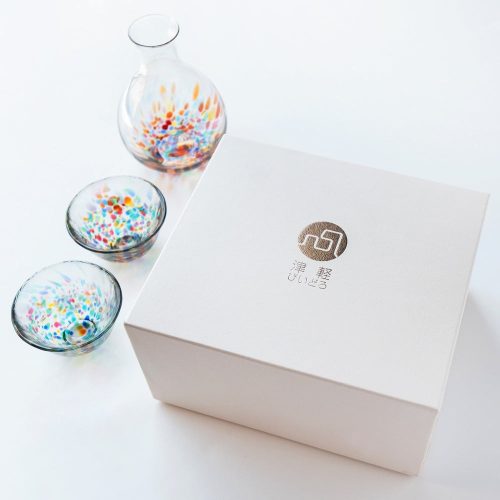 「津軽びいどろ」で仕立てた冷酒向けのガラス製徳利です。津軽びいどろとは、色ガラスを巧みに掛け合わせる青森伝統のガラス工芸品のこと。本製品では、東北三大祭りの1つ「ねぶた祭」の賑やかさと華やかさが8色のガラスで彩り豊かに表現されています。