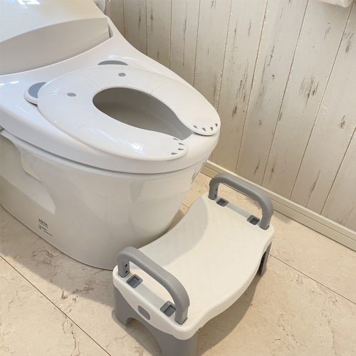 ステップ付きの補助便座です。足がステップに着いて安定することで、踏ん張りやすいのが特徴。自分で乗り降りも行えるため、何でも1人でやりたがる時期にぴったりです。