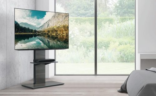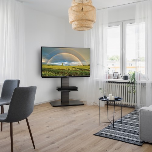 左右首振り機能を搭載した自立式テレビスタンドです。台座を動かすことなく画面を左右15°のあいだで角度調整できるのがメリット。コーナーに置いても、快適な視聴環境を実現できます。