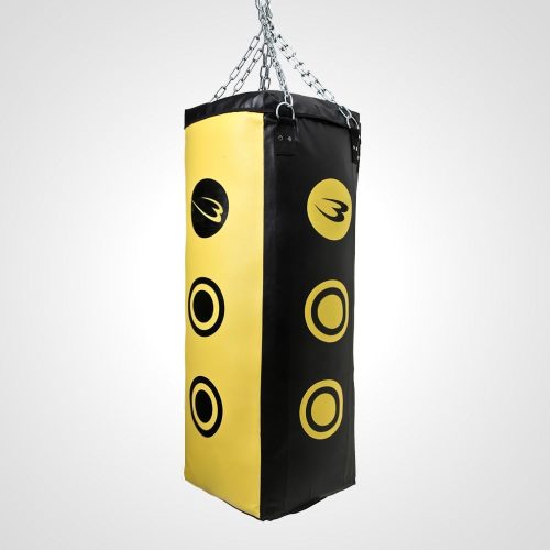 四角形状で打撃の角度を視覚化できるサンドバッグ。対角線を意識したポジショニングや腰のひねりを捉えやすく、効率的な動作習得をサポートします。4面に3箇所ずつターゲットが配置されており、集中力を高めた練習が可能です。