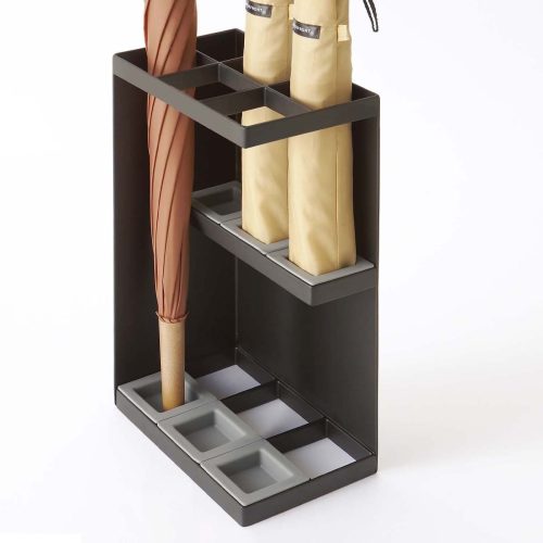 玄関の角にスマートに収まる角型傘立てです。幅16.5cmとスリムなボディで、狭い玄関でも邪魔にならないのがメリット。スチール製の本体とポリプロピレン製のトレイで安定感があり、6本の傘をしっかり収納できます。