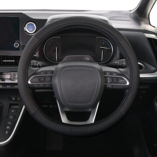 高級感のあるレザー調素材を採用したハンドルカバーです。ブラックのMOMOロゴがスタイリッシュな雰囲気を演出。車内の印象をワンランク上に押し上げます。表面は合成皮革、内面はTPE素材を使用しており、しっとりとした触り心地が特徴です。
