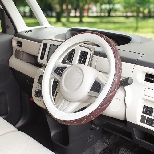 おしゃれなステッチが印象的な自動車用ハンドルカバー。ホワイトのラティスステッチとガトーブラウンの落ち着いたカラーが大人らしさを演出します。