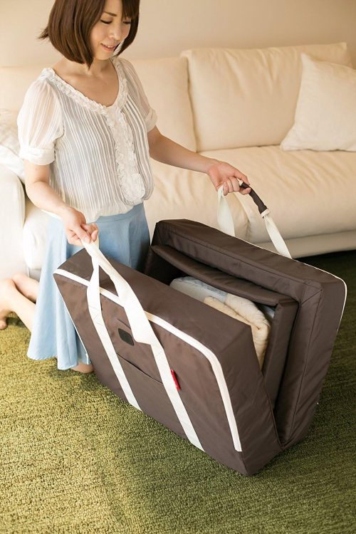 外出先で使いたい方におすすめのベッドインベッドです。折りたたんでコンパクトに収納可能。長さを調節できるショルダーベルト付きで、肩に掛けてスマートに持ち運べます。