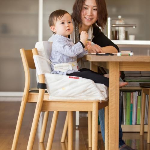 L字型に変形させると、腰すわり後はお座りサポートとして活躍します。腰ベルトで赤ちゃんの体をしっかりホールドし、安定した姿勢をキープ可能。8ヶ月以降は大人用イスに固定して、ご家族と同じテーブルでの食事も楽しめます。