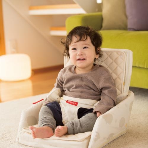 腰がすわる頃には腰ベルト付きのお座りサポートに変化。さらに、大人用チェアに固定すればベビーチェアとしても活用できます。2つ折りにしてコンパクトに持ち運べるのもポイントです。