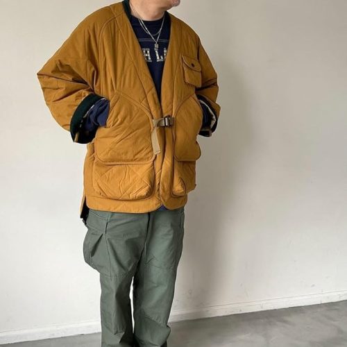 ハンティングジャケットの仕様を取り入れた機能的な冬の羽織り。「コンビニまで手ぶら」をコンセプトに設計されており、ビールやつまみを入れるのに便利なポケットが特徴です。寒いときに手をあたためられるハンドウォーマーポケットも備わっています。