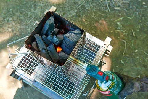 火起こし器を使うときは、まず着火剤を並べてから火起こし器をセットします。その上から炭を入れ、下に置いた着火剤に火をつけます。
