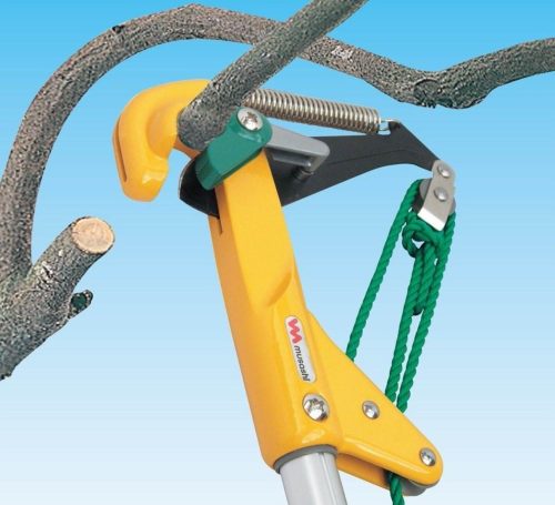 ロープを引いて操作する高枝切りバサミ。ロープを取り付けたグリップを下に引くことで、枝を切断する仕組みです。直径25mmまでの太い枝を軽い力で簡単に切断できます。付属のノコギリは300mmのボラゾン研磨刃。25mmよりも太い枝の切断に便利です。