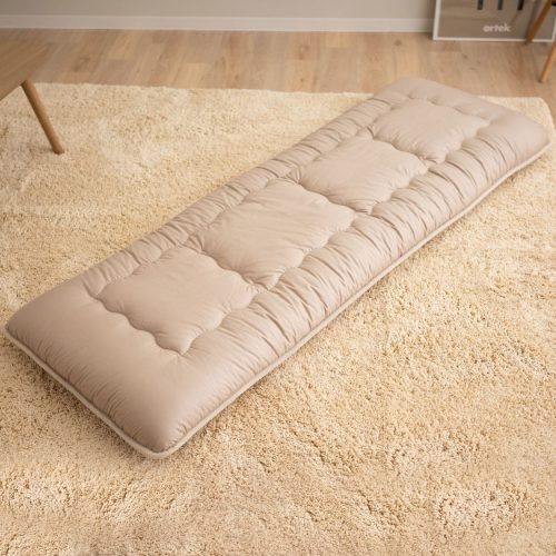 折りたたみに対応しているため、キャンプ時の携行や車内への持ち込みも簡単。3つ折りすれば60cm四方まで小さくなり、ベッドの下やクローゼットの中へコンパクトに収納可能です。来客時にだけ使う長座布団としても適しています。