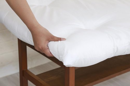 中材には、三層構造を採用しています。ふんわりとやわらかい中わたを上層・下層に配置し、弾力のある「固わた」を挟み込んでいるのが特徴。薄めの本体でありながら、バランスよく圧力を吸収でき、底つき感を抑えられます。