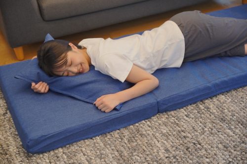 体をしっかり支える高反発タイプで、硬いフローリングの上でも快適に寝転べます。表面にはやわらかいニット生地を採用しており、快適な肌触りです。