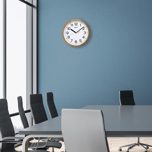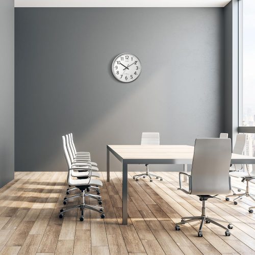 文字盤を広く確保したオフィス向けの電波掛け時計。枠を細くすることで視認エリアを拡大しており、離れた位置からでも時刻を確認しやすい設計が魅力です。直径360×奥行45mmのサイズで、重量は970g。プラスチック枠にガラス製の風防を組み合わせたシンプルなデザインで、オフィスや店舗などでの使用におすすめです。