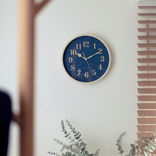 ブルーの文字盤が落ち着いた雰囲気を演出するおしゃれな壁掛け時計。ビンテージライクなデザインで、ナチュラル・ウォールナットの2種類を展開しています。文字盤には、クラフト数字を採用。ブルーの色味や木目調のフレームと相まって、モダンかつビンテージな雰囲気が漂います。