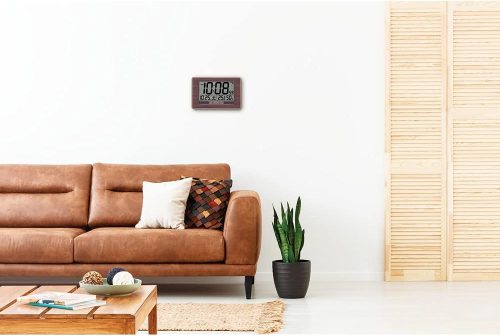 高精度な温度・湿度表示を備えたハイブリッドソーラーデジタル時計。木目模様の茶色い枠が高級感を演出します。デジタル文字高69mmの大型表示で、離れた場所からも時刻を確認しやすいのが魅力。明るい場所ではソーラーで、暗い場所では乾電池で動作するハイブリッド方式を採用し、電池寿命は約7年間です。