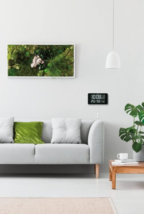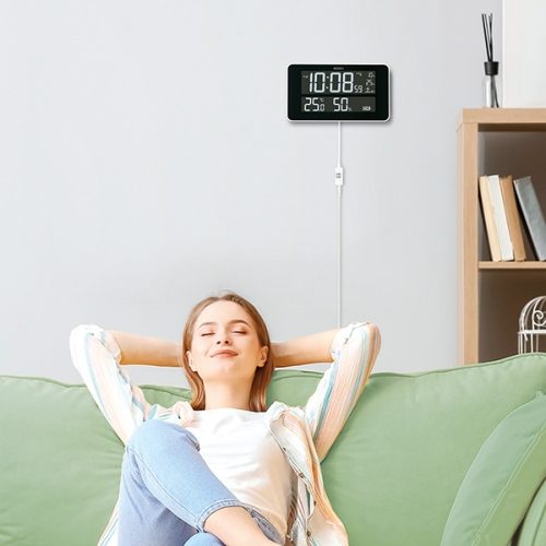 色表示で室内環境を伝える壁掛け可能なデジタル電波時計。高コントラストの白色LEDと、44mmの大きな文字でくっきりと時刻を表示します。温湿度表示機能を搭載しており、0~40℃の温度と20~90%RHの湿度を測定可能です。
