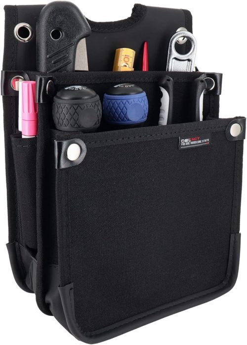 仕切りが少ないシンプルな構造でも、DIY用途なら十分。バックルでワンタッチで着脱できるモノは、作業の合間に外したいときスムーズです。工具の落下を防ぐコード用の穴がある製品も作業がはかどります。