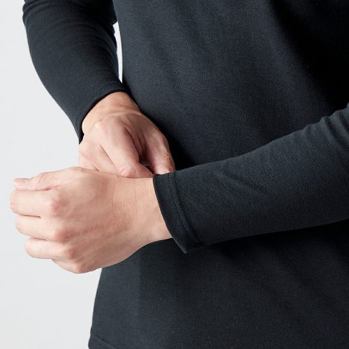 9分袖設計で袖が出過ぎず、脇縫がない仕様なので着心地も良好。汗をしっかり吸収してもムレにくく、冬の汗冷えを軽減します。天然素材の冬用インナーを探している方におすすめです。