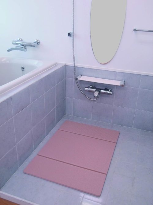衝撃に強いポリエチレンを素材に使用した浴室内マット。約2cmの厚みがあるので、万が一転んだときも衝撃を和らげます。浴室の床からの冷気も妨げるため、ヒートショック対策にもおすすめと謳われる製品です。