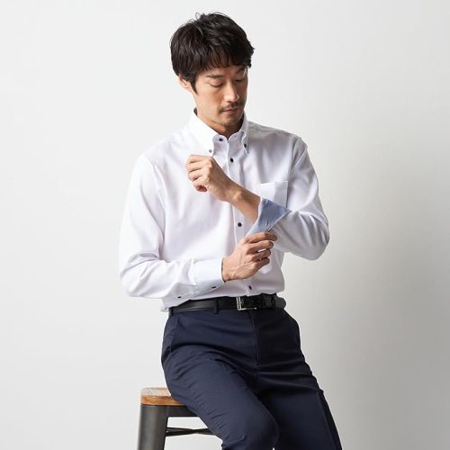 ゆったりとしたレギュラーシルエットを採用し、伸縮性がある素材で動きやすさも良好。白無地のボタンダウンデザインで、ビジネスシーンからリクルートまで幅広く対応します。忙しい日々を送る方におすすめのアイテムです。