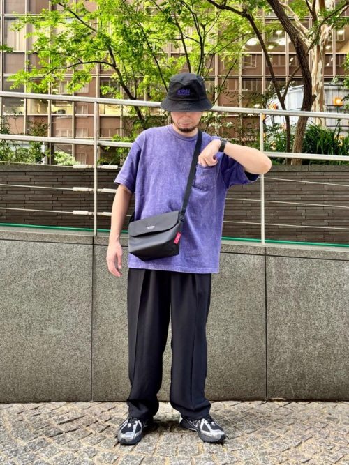 ヴィンテージライクな紫のTシャツに、ゆったりとした黒のパンツを合わせたリラックスカジュアルなスタイル。ちょっとした外出に便利な黒のメッセンジャーバッグがポイントです。