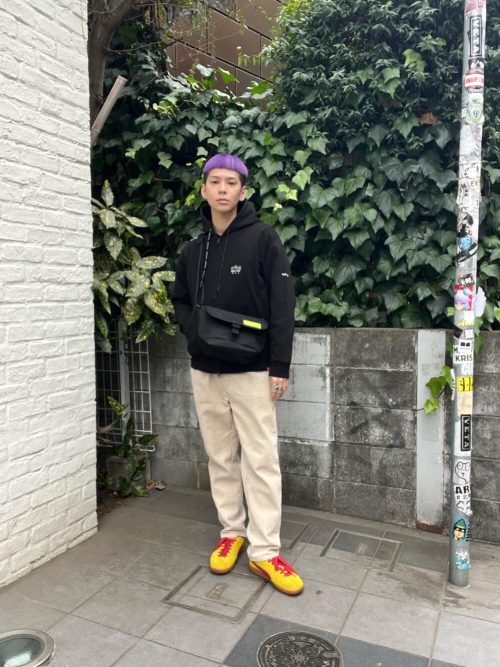 黒のパーカーにベージュのパンツを合わせた、カジュアルなコーデです。メインアイテムである黒のメッセンジャーバッグは小ぶりなサイズ感。ネオンカラーのパーツがさりげないアクセントを与えてくれます。