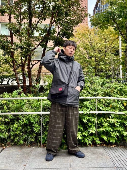 落ち着いた配色のウェアに対し、足元にイエローとレッドのスニーカーを合わせて遊び心をプラス。トップスとバッグの色をそろえることで、まとまりのある印象に仕上げています。