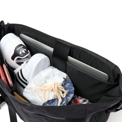日本製バリスターナイロンをメイン素材に用いたメッセンジャーバッグです。車のエアバッグや防弾チョッキにも採用される66ナイロン糸で織り上げた素材を採用。一部にはターポリン生地を配し、高い耐水性も備えています。