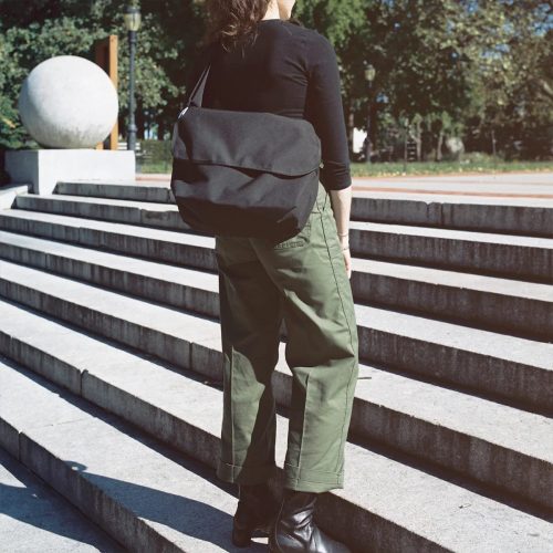 メッセンジャーバッグの定番ディテールを踏襲しつつ、全体のサイズをコンパクトにまとめたシンプルなフォルムが特徴。ユニセックスで着用できるため、カップルやパートナーとのシェアにも向いています。