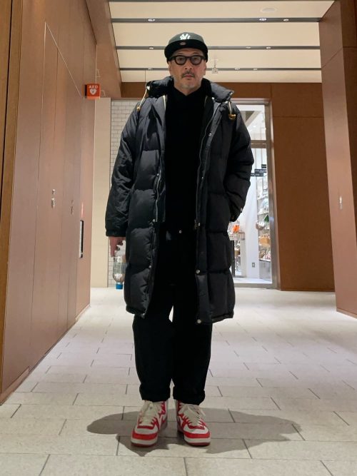 足元には赤と白のスニーカーを合わせ、コーデにアクセントをプラス。重くなりがちな冬のオールブラックコーデに、遊び心と軽快さを加えています。