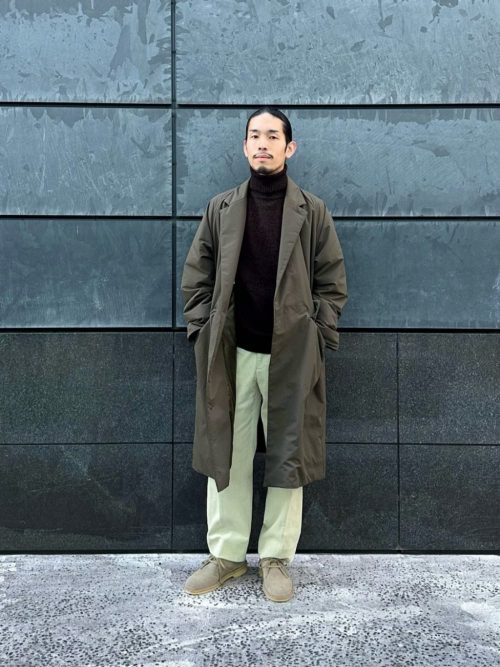 やわらかいカラーでまとめているコーディネートです。インナーにはダークブラウンのタートルネックセーターを合わせ、首元まであたたかな印象。ゆったりとしたシルエットのコートが、リラックス感を演出しています。