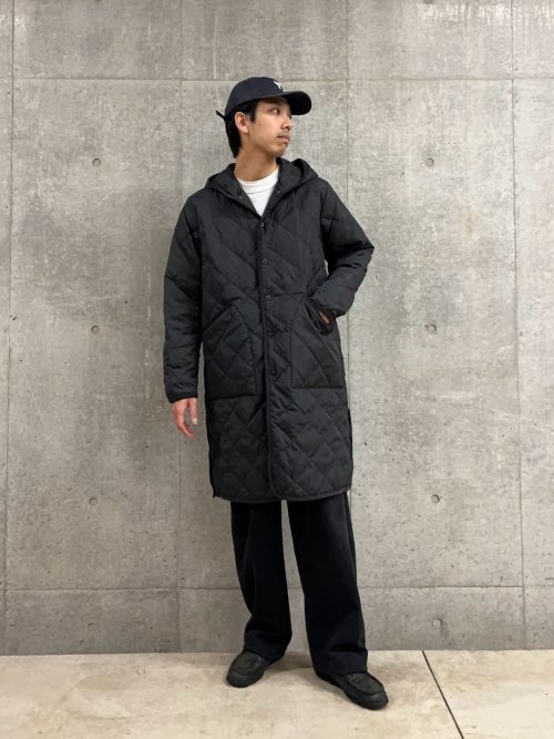 ブラックのロングキルティングコートを主役にした、冬のモノトーンコーデです。アウターはフード付きでカジュアルな雰囲気を演出しています。インナーに白のTシャツを覗かせ、重くなりがちな黒のコーデに抜け感を出しているのがポイントです。