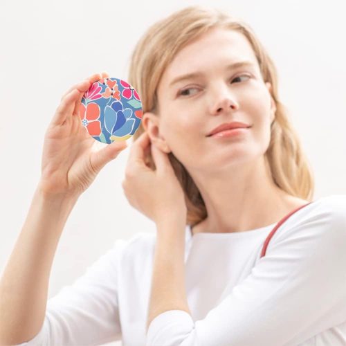 フォルムもシンプルな丸型やスクエア型のほか、ハート型、花の形などさまざま。色は、キュートなテイストが好きな方なら鮮やかなカラーを用いたものやカラフルなものがおすすめです。一方で、白や黒の手鏡は大人っぽさを演出できます。