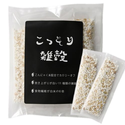 11種類の雑穀とこんにゃく米を配合した雑穀米です。アマランサス・もち麦・キヌア・ひえなどの雑穀と、食物繊維が豊富な乾燥こんにゃく米を配合しています。乾燥こんにゃくはニオイが少なく、味なじみがよいのが魅力。また、カロリーオフなので、摂取カロリーを抑えたい方にぴったりです。