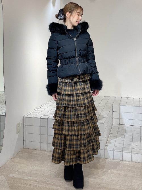 黒のダウンジャケットに、イエロー系のチェック柄ティアードスカートをあわせた冬のコーデです。ジャケットはウエストがマークされたデザインで、すっきりとした印象。フードと袖口にあしらわれた黒のファーが、華やかさを添えています。