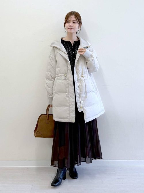 ライトベージュのダウンジャケットを主役にした、きれいめカジュアルな冬コーデ。インナーとスカートはダークカラーで統一し、アウターの白を引き立てます。ダウンジャケットはウエストのドローストリングを絞ることで、すっきりとした着こなしが可能です。