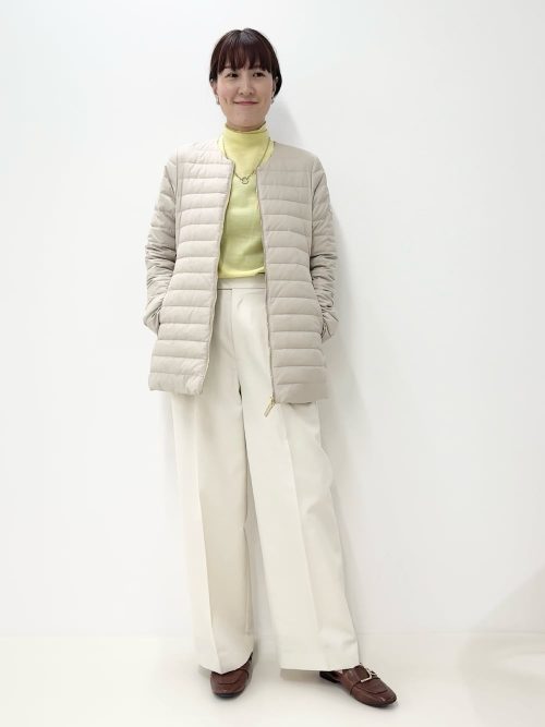 ベージュのノーカラーダウンジャケットに、同系色のワイドパンツをあわせたワントーンコーデです。軽やかなダウンジャケットがきれいめな印象を与えます。インナーにイエローのタートルネックをあわせ、華やか差を加えているのがポイントです。