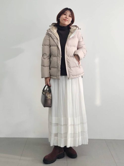 ベージュのダウンジャケットに、白のプリーツロングスカートをあわせた冬の装いです。ショート丈のダウンは上半身をコンパクトに見せるほか、フェミニンなスカートも好バランスにキマるのがポイント。インナーの黒のタートルネックが顔周りをすっきりと引き締めます。