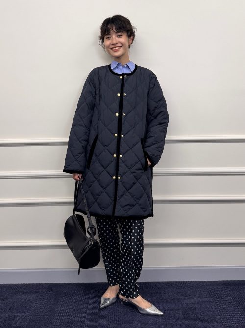 ネイビーのキルティングダウンコートを主役にした、きれいめカジュアルスタイルです。襟なしのデザインにベロアパイピングとゴールドのボタンが上品なアクセント。インナーに水色のシャツを覗かせることで、顔周りを明るく演出します。