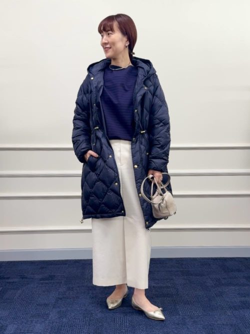 ダウンコートのウエストを絞り、女性らしいシルエットを演出。ゴールドの金具が上品なアクセントになっています。足元はメタリックカラーのフラットシューズで、洗練された抜け感をプラス。冬のお出かけにぴったりなスタイルです。